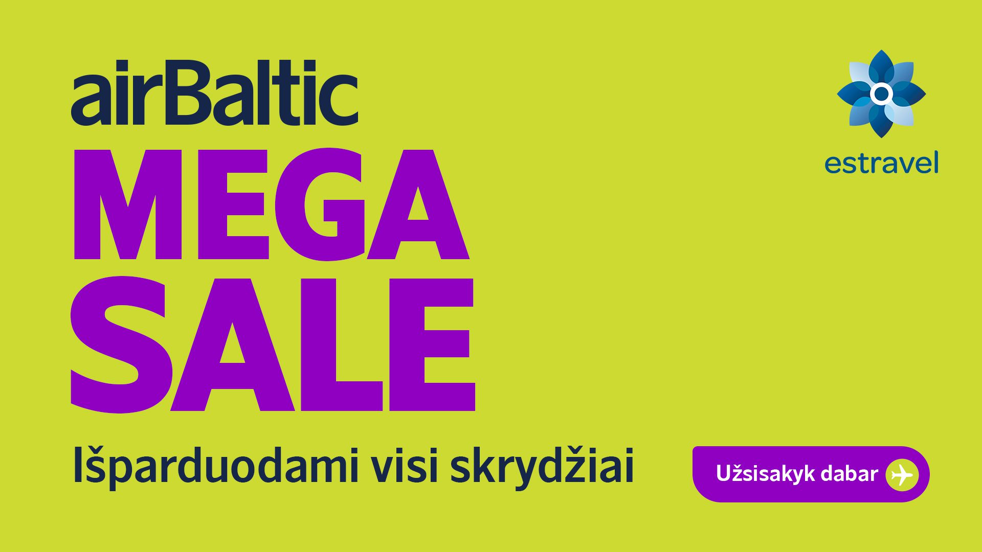 Dalinamės puikiomis žiniomis: mūsų partneriai, aviakompanija airBaltic, skelbia skrydžių skrydžių bilietų išpardavimą – MEGA SALE – visomis kryptimis. Tai puiki proga įsigyti pigius lėktuvų bilietus kelionėms nuo rugpjūčio iki kitų metų pavasario. Gera žinia ir ta, kad už kiekvieną MEGA SALE metu įsigytą bilietą keleivis gaus dvigubai daugiau airBaltic Club taškų nei įprastai. Verta paskubėti, nes bilietų kiekis nurodytomis mažesnėmis kainomis yra labai ribotas.