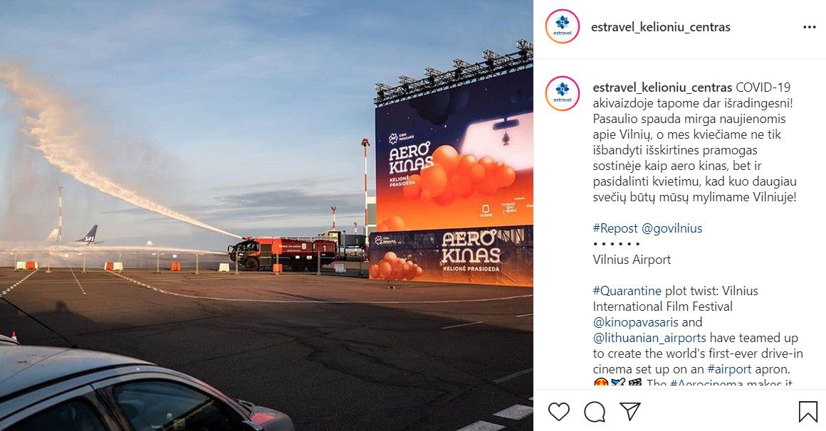 Another impressive project in the capital of Lithuania started on the 30th of April, 2020. “Kino pavasaris”, one of the best known International Movie festivals in Lithuania presented their new cycle of experiential sessions – “AeroCinema – the journey begins”. For the first time in the history, Vilnius airport apron area here planes take-off and lands, became a Drive-In Cinema. The residents and guests of Vilnius who long for spectacular experiences and travels will be able to enjoy a different type of traveling – seeing a world on the wide screen. Throughout a month people will be able to watch the films created by the world’s most famous directors. Worth to mention – the films are shown on the largest screen ever built in the Baltic states! The size of it is close to the five-story building!
