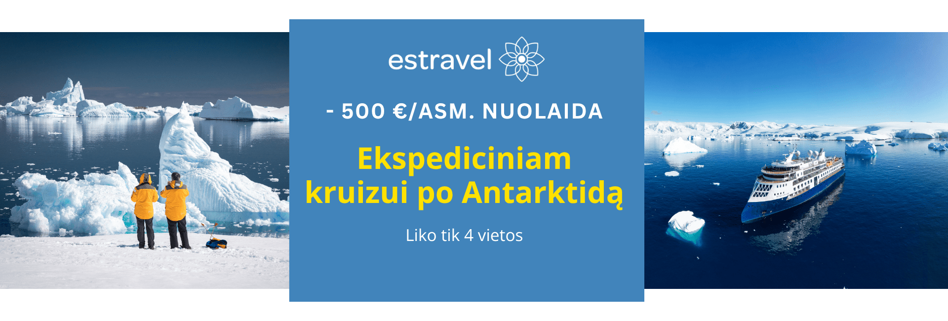 Išskirtinis pasiūlymas „Grūdo kelias 2025” renginio dalyviams -500 €/asm. nuolaida ekspediciniam kruizui į Antarktidą. Tai įsimintinas 15 d.gyvenimo nuotykis, į kurį leisitės su lietuviškai kalbančiu kelionės vadovu. Išplaukimo data – 2026.11.18. Kelionės programa – žiūrėti čia. Šiuo išskirtiniu pasiūlymu galite pasinaudoti prieš ir renginio metu. Kviečiame spausti mygtuką žemiau, užpildyti formą – Estravel komanda susisieks su Jumis aptarti užsakymo detalių.