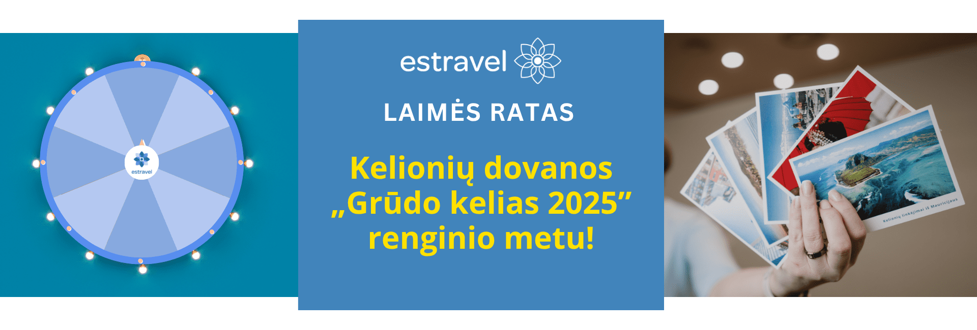 „Grūdo kelias 2025” renginyje Estravel turės savo palapinę, kurioje galėsite gyvai pasišnekučiuoti su mūsų komanda bei sudalyvauti žaidime, sukant laimės ratą. Šiame žaidime – LAIMI VISI! Jums reikės užpildyti dalyvio kortelę ir sukti ratą, o jei dar iki renginio registravotės pagrindinio prizo, egzotinės kelionės, žaidime – tuomet galėsite sukti ratą be eilės.