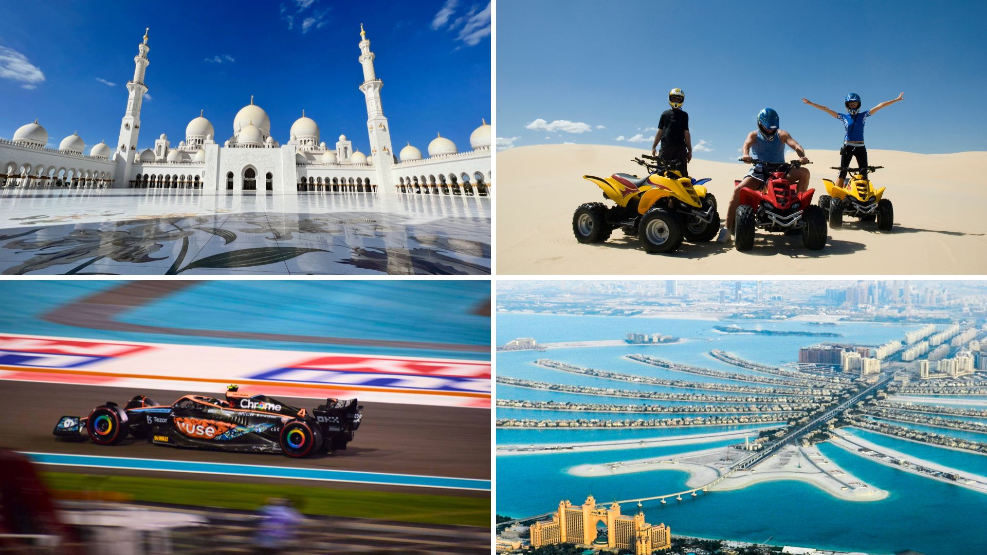 F1 Abu Dabio Grand Prix renginys: pamatykite Formulės 1 automobilių lenktynes vainikuojantį renginį ir mėgaukitės įsimintinais koncertais ir emocijomis visą savaitgalį.- Architektūros ir inžinerijos kūriniai: aplankykite aukščiausią pasaulio pastatą Burj Khalifa, dirbtinę salą Džumeiros palmę, Luvro muziejų Abu Dabyje, Ateities muziejų Dubajuje ir dar daugiau.