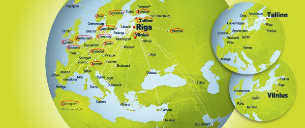 - Iš Rygos į: Ciurichą, Sankt Peterburgą, Bilundą, Liepają, Minską, Turku, Varšuvą, Prahą, Budapeštą, Dubrovniką, Rijeką, Kataniją, Tel Avivą, Romą.