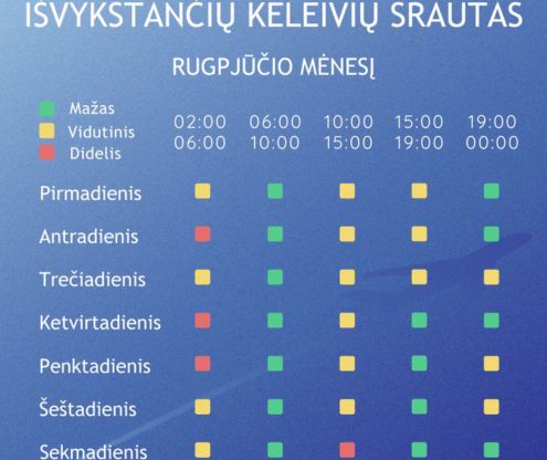Pikų laikai Vilniaus oro uoste rugpjūtįVasaros laikotarpis – labai intensyvus kelionių metas. Daugėjant skrydžių į saulėtas kryptis, išauga ir keleivių skaičius oro uostuose. Jūsų patogumui – keleivių srautų grafikas rugpjūčio mėn., kuris padės įsivertinti oro uosto užimtumą ir tinkamai susiplanuoti atvykimą į oro uostą! |