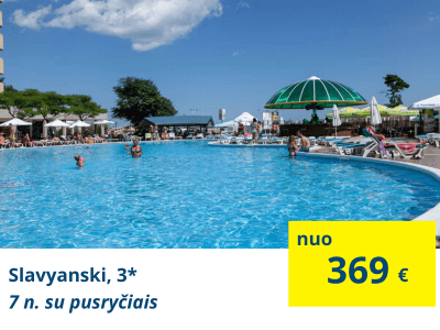 TOP VIEŠBUTIS IEŠKANTIEMS MAŽIAUSIOS KAINOSSlavyanski, 3* (su pusryčiais)Ekonominės klasės viešbutis, kuris yra apie 50 m iki paplūdimio. Viešbutis skirtas tiems poilsiautojams, kurie nori pakeliauti po Burgasą ir aplinkinius Bulgarijos miestus, o viešbutį pailsėti ir pernakvoti. |