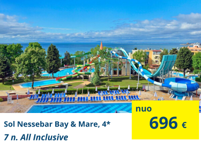 TOP VIEŠBUTIS ŠEIMŲ POILSIUISol Nessebar Bay & Mare, 4* (viskas įskaičiuota)Viešbutis įsikūręs atokiau nuo Nesebaro miesto. Kambariai jaukūs, erdvūs, kokybiškai įrengti. Puikus pasirinkimas šeimoms, norinčioms ramaus poilsio. Viešbučio teritorijoje yra didžiulis baseinas su vandens kalneliais. |