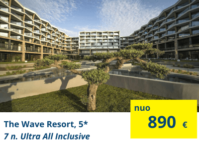 TOP VIEŠBUTIS PRABANGIAM POILSIUIThe Wave Resort, 5* (ultra viskas įskaičiuota)Stilingas ir prabangus viešbutis, įsikūręs ant jūros kranto. Keliautojai itin giria erdvius viešbučio kambarius, modernų interjerą, gardų maistą ir teikiamų paslaugų kokybę. |