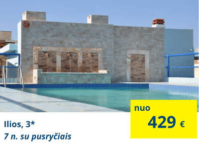 TOP VIEŠBUTIS IEŠKANTIEMS MAŽIAUSIOS KAINOSIlios, 3* (su pusryčiais)Populiarus pasirinkimas ieškantiems mažiausios kainos pasiūlymo atostogoms Kretoje. Viešbutis yra netoli smėlio-žvyro paplūdimio ir Chersonisos kurorto centro. Ant viešbučio stogo yra baseinas. Puikus pasirinkimas, norintiems pakeliauti po salą, o viešbutyje tik pernakvoti. |