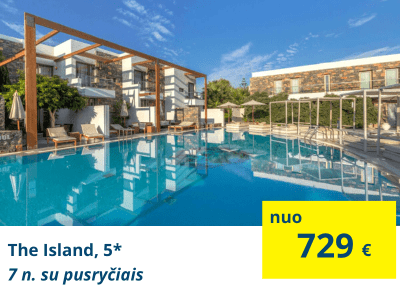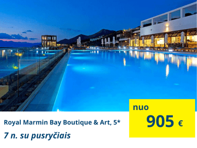 TOP VIEŠBUTIS PRABANGIAM POILSIUIRoyal Marmin Bay Boutique & Art, 5* (su pusryčiais)Viešbutis su panoraminiu vaizdu į jūrą. Turi išskirtinio dizaino kambarius. Taip pat, tai pirmas viešbutis Graikijoje turintis sertifikatą, įrodantį, kad viešbutis vadovaujasi „eko“ politika. Viešbutyje gali ilsėtis tik suaugusieji, čia nėra pramoginių programų, visos pramogos skirtos atsipalaidavimui, ramybei ir išskirtiniam poilsui. |