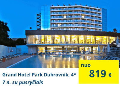 TOP VIEŠBUTIS PORŲ POILSIUIGrand Hotel Park Dubrovnik, 4+* (su pusryčiais)Viešbutyje yra didelis lauko baseinas, SPA zona su vidaus baseinu. Viešbutį sudaro pagrindinis viešbučio pastatas ir 2 istorinės vilos. Svečiai gali nemokamai naudotis SPA centru, kuriame yra treniruoklių salė, saunos. |