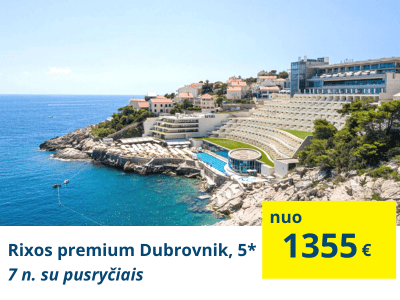 TOP VIEŠBUTIS PRABANGIAM POILSIUIRixos premium Dubrovnik, 5* (su pusryčiais)Viešbutis įsikūręs ant kalvos, su nuostabiais panoraminiais vaizdais į Adrijos jūrą iš bendrų patalpų ir daugumos kambarių. Veikia visus metus siūlydmas įvairius patogumus, pagal sezoniškumą. Dviejų aukštų SPA centre yra turkiška pirtis, vidaus ir lauko baseinai bei įvairių procedūrų zonos. Norintiems linksmybių ir pramogų, viešbutis siūlo kazino. Dubrovniko senamiestis yra netoli nuo viešbučio, todėl iki jo galima nueiti pėsčiomis. |