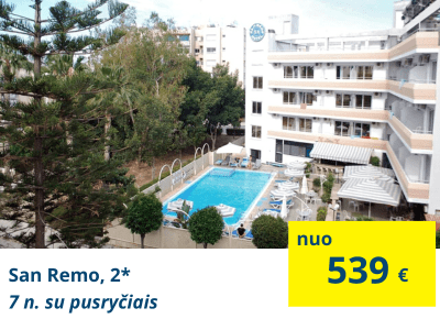 TOP VIEŠBUTIS IEŠKANTIEMS MAŽIAUSIOS KAINOSSan Remo, 2* (su pusryčiais)Ekonominės klasės viešbutis, kuris yra įsikūręs ramioje vietoje, 10 minučių kelio pėsčiomis nuo Finikoudes alėjos. Atstumas iki smėlio paplūdimio yra apie 300 metrų. |