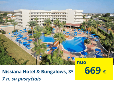 TOP VIEŠBUTIS ŠEIMŲ POILSIUINissiana Beach, 3* (su pusryčiais)Viešbutis prie pat Nissi paplūdimio, gražiausio balto smėlio paplūdimio Agia Napoje. Netoli viešbučio taip pat yra parduotuvės, barai, restoranai. Keliautojai puikiai vertina viešbučio baseinus, aktyvių pramogų asortimentą, yra žaidimų kambarys ir žaidimų aikštelė vaikams. |