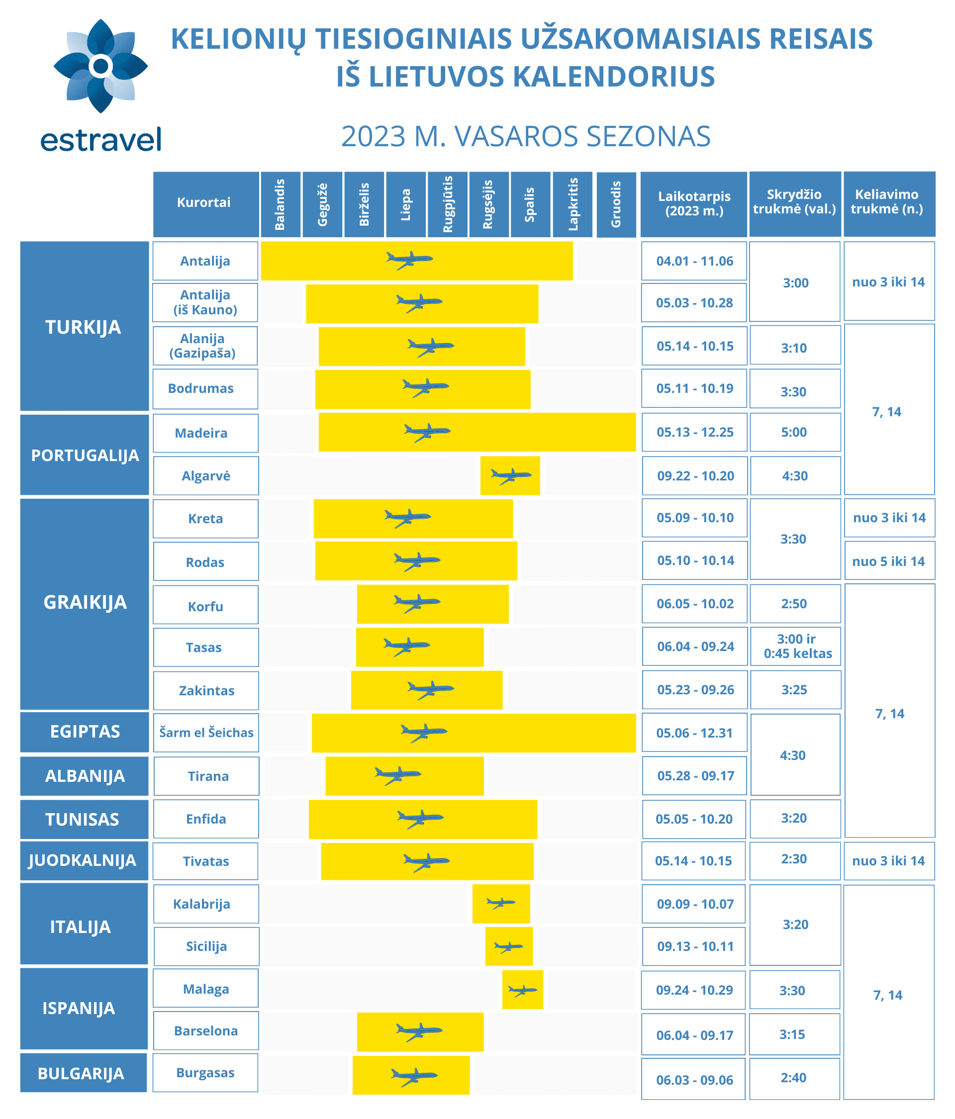 Tiems, kurie mėgsta keliones planuoti tiesioginiais užsakomaisiais skrydžiais, parengėme atskirą kelionių kalendorių*. Estravel kelionių kalendorius padės lengvai susiorientuoti ir rasti atsakymus kur keliauti nuo gegužės iki pat lapkričio mėn.