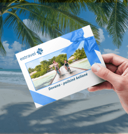 KELIONĖ – GERIAUSIA INVESTICIJA75 € pradinė įmoka yra puiki dovana ir investicija, paskatinanti artimą žmogų keliauti. Tokios vertės Estravel dovanų kuponą galite įsigyti bet kuriuo paros metu – internetu ir gauti į el. paštą per 1-2 min. Už jį galima įsigyti poilsines, pažintines keliones, lėktuvų ar keltų bilietus ir kt. |