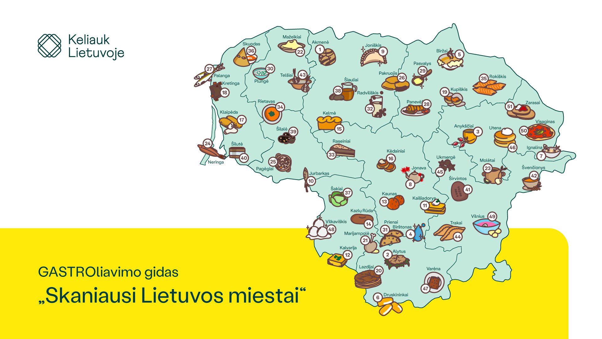 Nacionalinė turizmo skatinimo agentūra VšĮ „Keliauk Lietuvoje“ kartu su Lietuvos turizmo informacijos centrais pristatė unikalų patiekalų, kurie yra tapę savotiškais miestų simboliais, teminį žemėlapį – „Skaniausi Lietuvos miestai“. Šis žemėlapis skirtas keliautojams, kurie neįsivaizduoja kelionių po Lietuvą be ragavimo ir regioninės virtuvės atradimų. Be to, ar žinojote, kad terminas „GASTROliuoti“ nuo šiol – oficialus naujažodis, apibūdinantis keliavimą ieškant degustacinių patirčių?