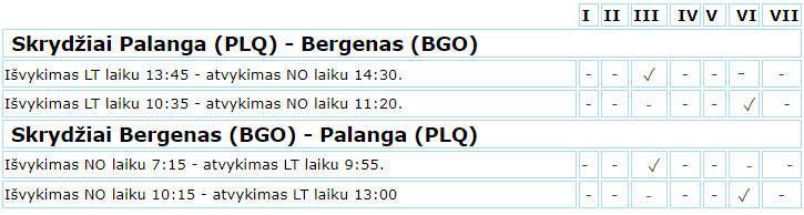 Tiesioginiai skrydžiai bus vykdomi kiekvieną trečiadienį ir šeštadienį. Skrydžių laikas – išskrisite X, grįšite Y. Daugiau informacijos žiūrėkite skrydžių tvarkaraštyje: