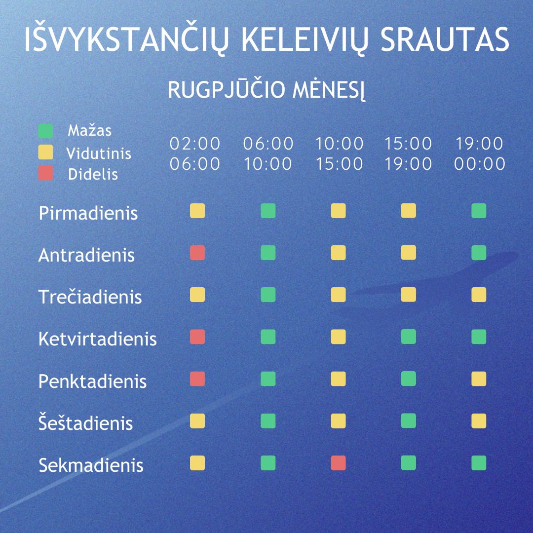 Vasaros sezonu gerokai išauga keliaujančių lėktuvais skaičius, todėl tai lemia didesnius žmonių srautus oro uostuose. Lietuvos oro uostai pateikia keleivių srautų grafiką liepos mėn., kuris leis įsivertini oro uosto užimtumą ir dar sklandžiau suplanuoti savo kelionę. Jei Jūsų skrydis patenka į intesyviausių valandų laikotarpį, tereikia tinkamai pasiruošti oro uosto procedūroms. Kad visai tai padaryti būtų lengviau ir paprasčiau, dalinamės keliais patarimai: