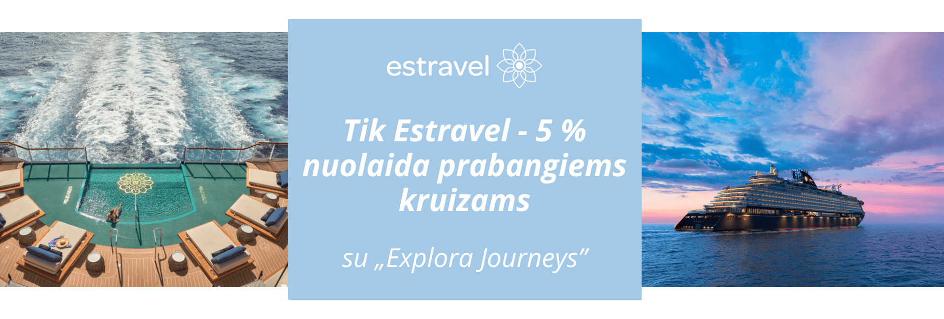 „Explora Journeys” kruizai – išsiskiria šiuolaikine elegancija, žavi išskirtiniu dėmesiu detalėms, kruopščiai parinktomis patirtimis bei įspūdingais kruiziniais maršrutais po pasaulį. Išskirtinai Estravel klientams, užsakant kruizą iki liepos 14 d. taikoma 5 % nuolaida užsakymui. Ir tai dar ne viskas – užsakant kruizą iki liepos 15 d., kajutei priklauso iki 1000 € kreditas, kuriuo galima pasinaudoti įvairioms paslaugoms laive.