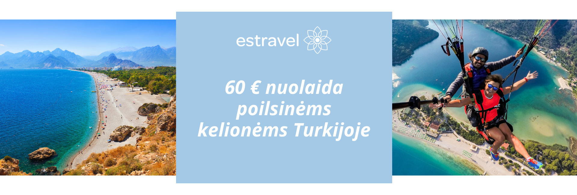 Užsakymams iki liepos 15 d. taikoma net 60 € nuolaida atrinktuose viešbučiuose Turkijoje. Kelionė turi įvykti iki 2025.07.31. Dėl kėlionės užsakymo kviečiame kreiptis tiesiogiai į Estravel komandą.