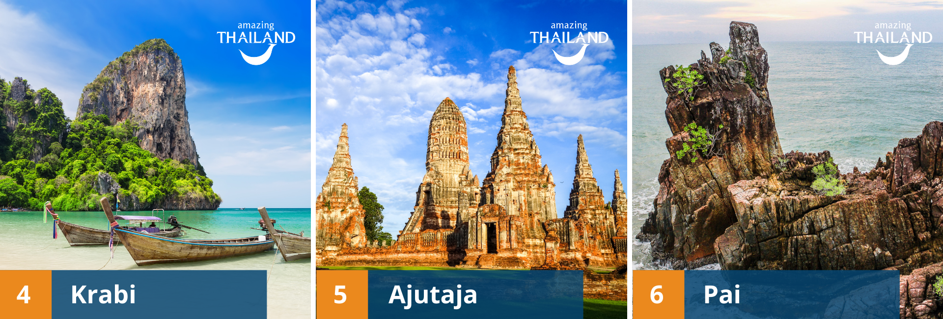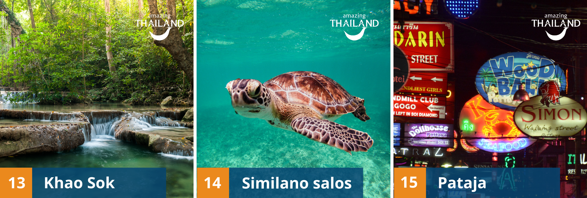 - Similano salos – vienos gražiausių visame Tailande. Similano salos susideda iš 11-os salelių, kiekviena jų savita ir turi ką parodyti keliautojui. Čia galima mėgautis povandeniniu pasauliu nardant, mėgautis paplūdimio poilsiu, sutikti įvairiausių gyvūnų.