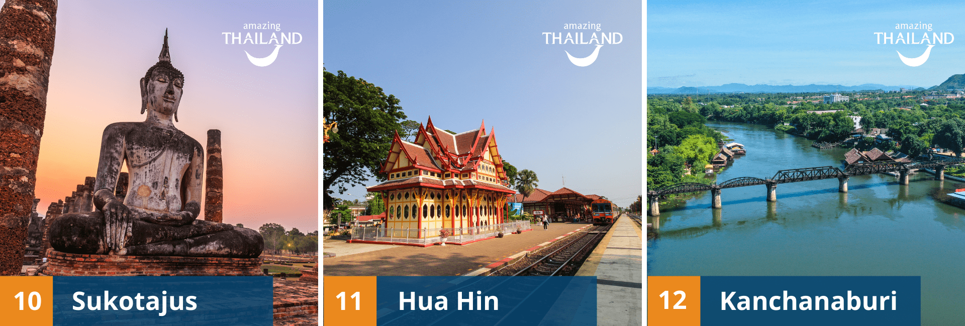 - Kanchanaburi – čia galima išvysti Kwai upę, kuri turi reikšmingą istorinį kontekstą. II-ojo pasauinio karo metais šalia jos nusidriekė Tailandą ir Mianmarą jungiantis geležinkelis, dėl didelio aukų skaičiaus gavęs Death Railway pavadinimą.