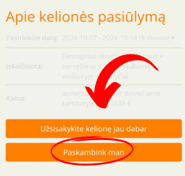 NORITE APTARTI ATOSTOGŲ PLANUS TELEFONU? REZERVUOKITE SKAMBUTĮPrimename, kad Estravel.lt, prie kiekvieno kelionės pasiūlymo galite rasti mygtuką “Paskambink man”. Jei norite taupyti savo laiką, aptarti kelionės planus ir iš karto užsakyti kelionę kol kalbate su kelionių ekspertu – spauskite “Paskambink man” mygtuką, rezervuokite norimą skambučio laiką ir mes su Jumis susisieksime. |