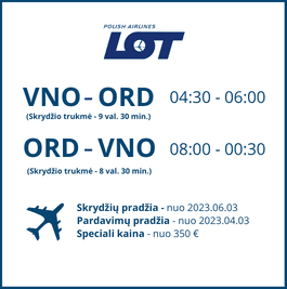 NAUJIENA: TIESIOGINIS SKRYDIS Į JAVUnikali naujiena – nuo birželio 3 d. prasideda tiesioginiai skrydžiai iš Vilniaus į Čikagą. Lėktuvų bilietus galima įsigyti jau nuo balandžio 3 d. Speciali lėktuvų bilietų kaina – nuo 350 €. Skrydžius vykdys Lenkijos avialinijos LOT Polish Airlines.* |