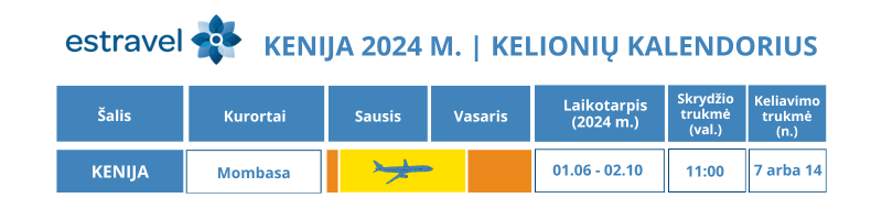 Jeigu ieškote egzotiško pasaulio kampelio su balto smėlio paplūdimiais, aukštaūgėmis palmėmis, svetingais ir paslaugiais vietiniais, nepaprasto grožio įdomybių kupina laukine gamta, žydru vandenynu ir nuostabiomis pažintinėmis patirtimis – Kenija tikrai paliks įspūdį. Estravel kelionių ekspertai su malonumu suplanuos Jūsų kelionę į Keniją – siųskite užklausą mums, rašykite keliones@estravel.lt arba skambinkite 85 212 58 05 ir pasikalbėkime dėl nuostabių laukinių atostogų Kenijoje.