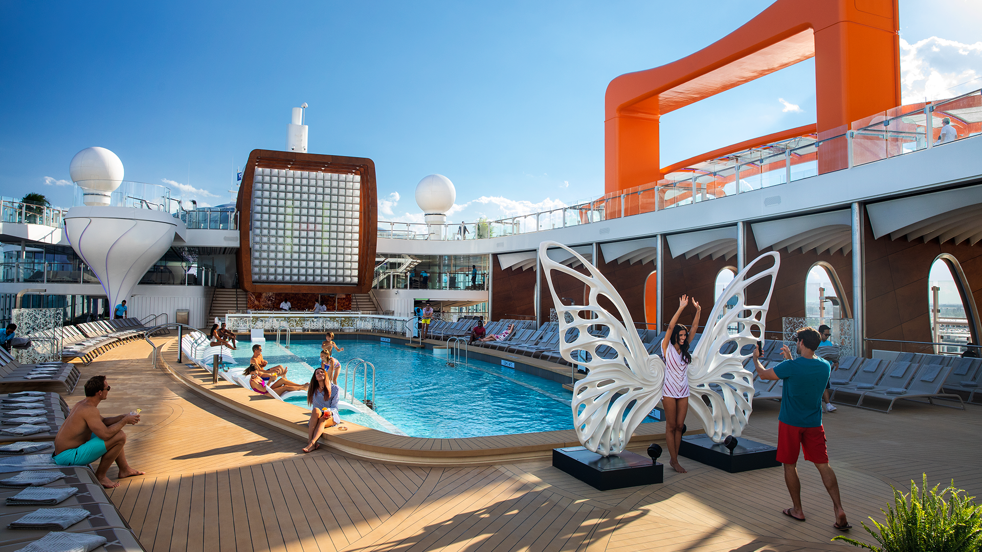 Vizitinė laivo kortelė – stiklinė Magic Carpet platforma, judanti tarp 2 ir 16 denių gali būti ir įlaipinimo zona (prie 2 denio), ir prabangaus baseino dalis (14 denis), ir išskirtinis Sky restoranas su atsiveriančiu nuostabiu vaizdu (16 denis).