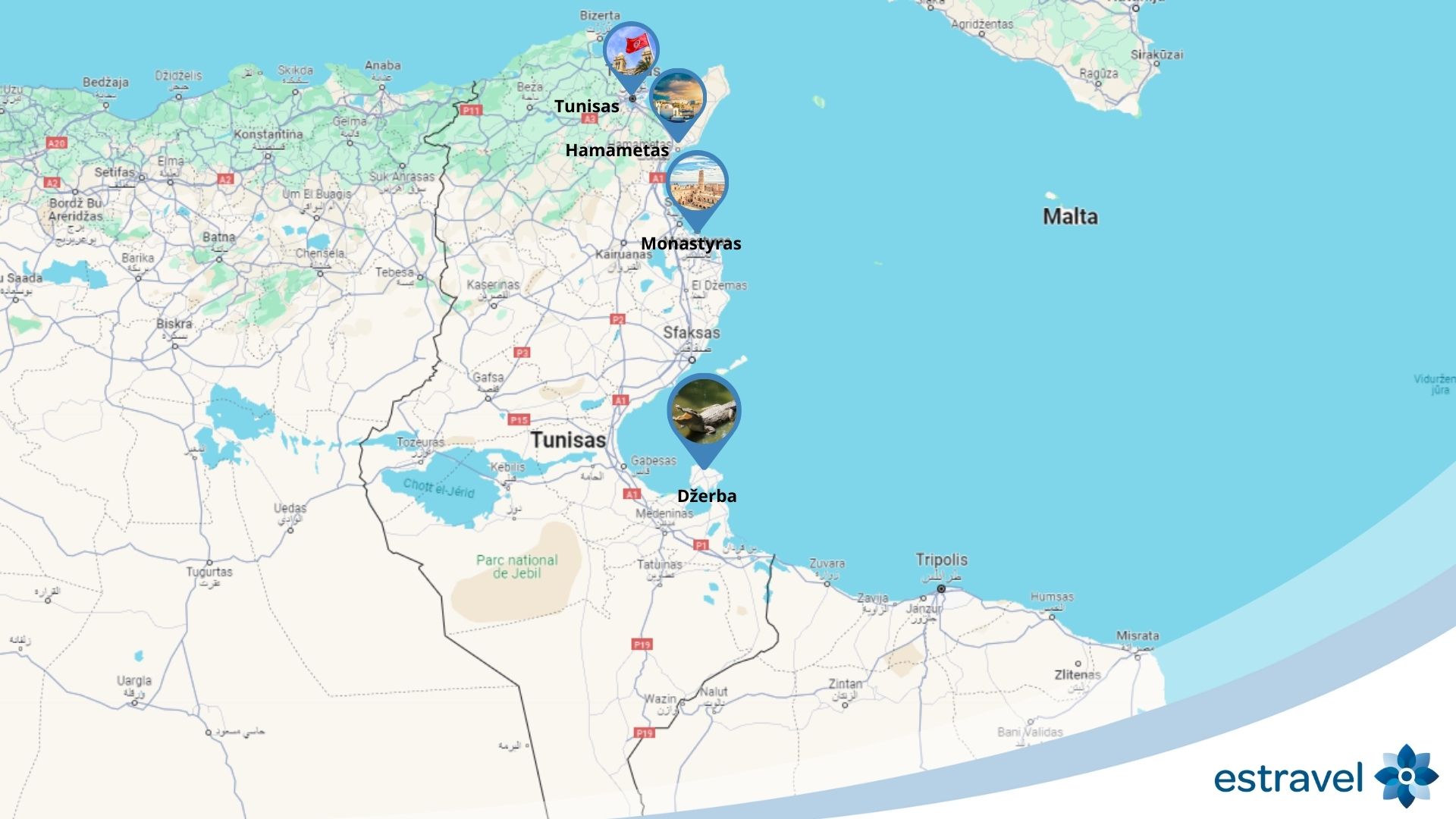 Tiesioginis užsakomasis skrydis į Tunisą iš Vilniaus trunka ~3 val. Dėl geriausios skrydžių jungties pagal Jūsų kelionės datą teiraukitės Estravel kelionių konsultanto.